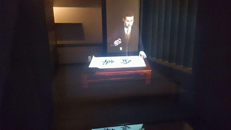 觀眾看到墻面上多個顯示設(shè)備中,每個顯示畫面中都有人物的視頻靜止影像。每臺電視下都有一個控制按鈕(可以是自動感應(yīng)器),當(dāng)觀眾按到其中一個時(當(dāng)自動感應(yīng)器撲捉有人接近 ……